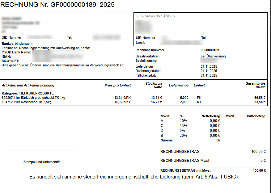 Pre rakúske faktúry sa použil ten istý model, ktorý sa používal na tuzemské faktúry. Do tohto modelu bolo pridané označenie, ktoré faktúru bude identifikovať ako rakúsku.
